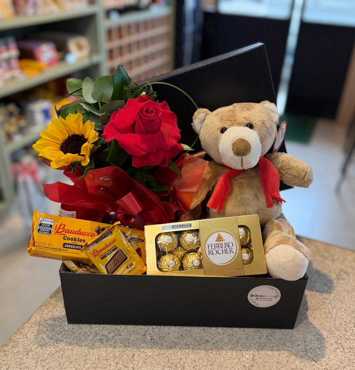 Maravilhosa Caixa com Arranjo de Rosa e Girassol, Chocolate Ferrero Rocher 100g, Urso Charmosinho, Biscoitos Bauducco e embalagme decorativa.. Também é possível fazer ela com tema romântico ou Aniversário.