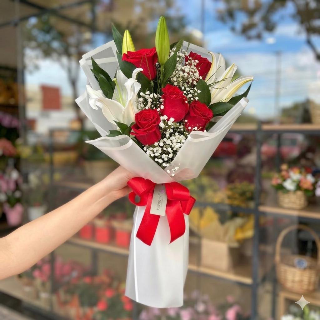 Maravilhoso buque com 5 Rosas Importadas, e Lírios Com Ruscos e Mosquitinhos com embalagem Coreana e laço cetim.